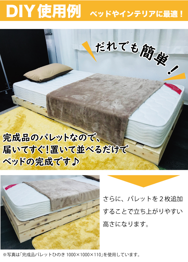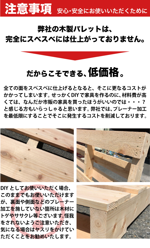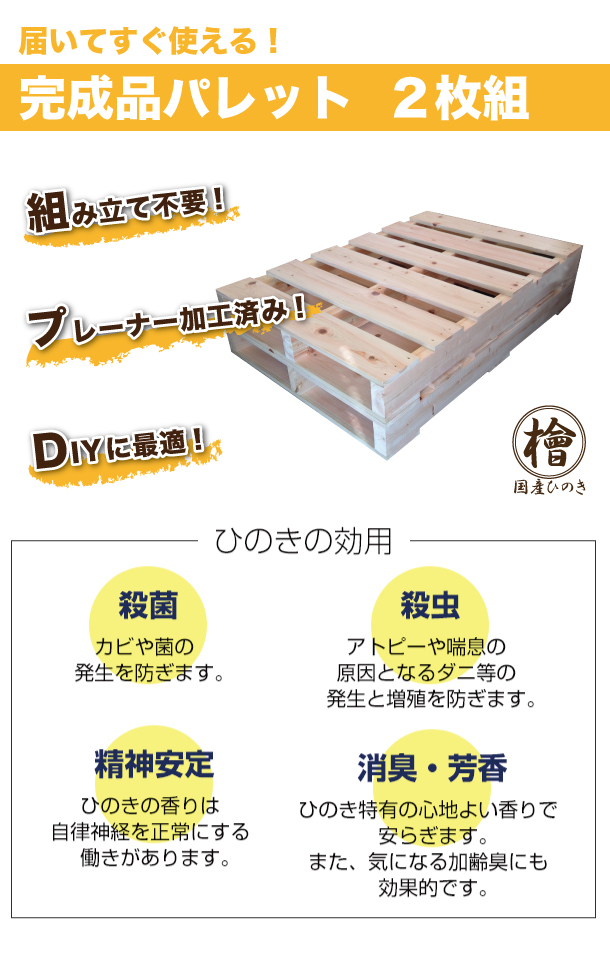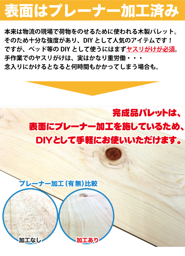 | セット内容 | 完成品パレット 700×1000×110(mm)2枚 洋紙ペーパー (紙ヤスリ) 1袋 4枚入(#100、#120、#180、#240 各粒度1枚ずつ)、ヤスリホルダー |